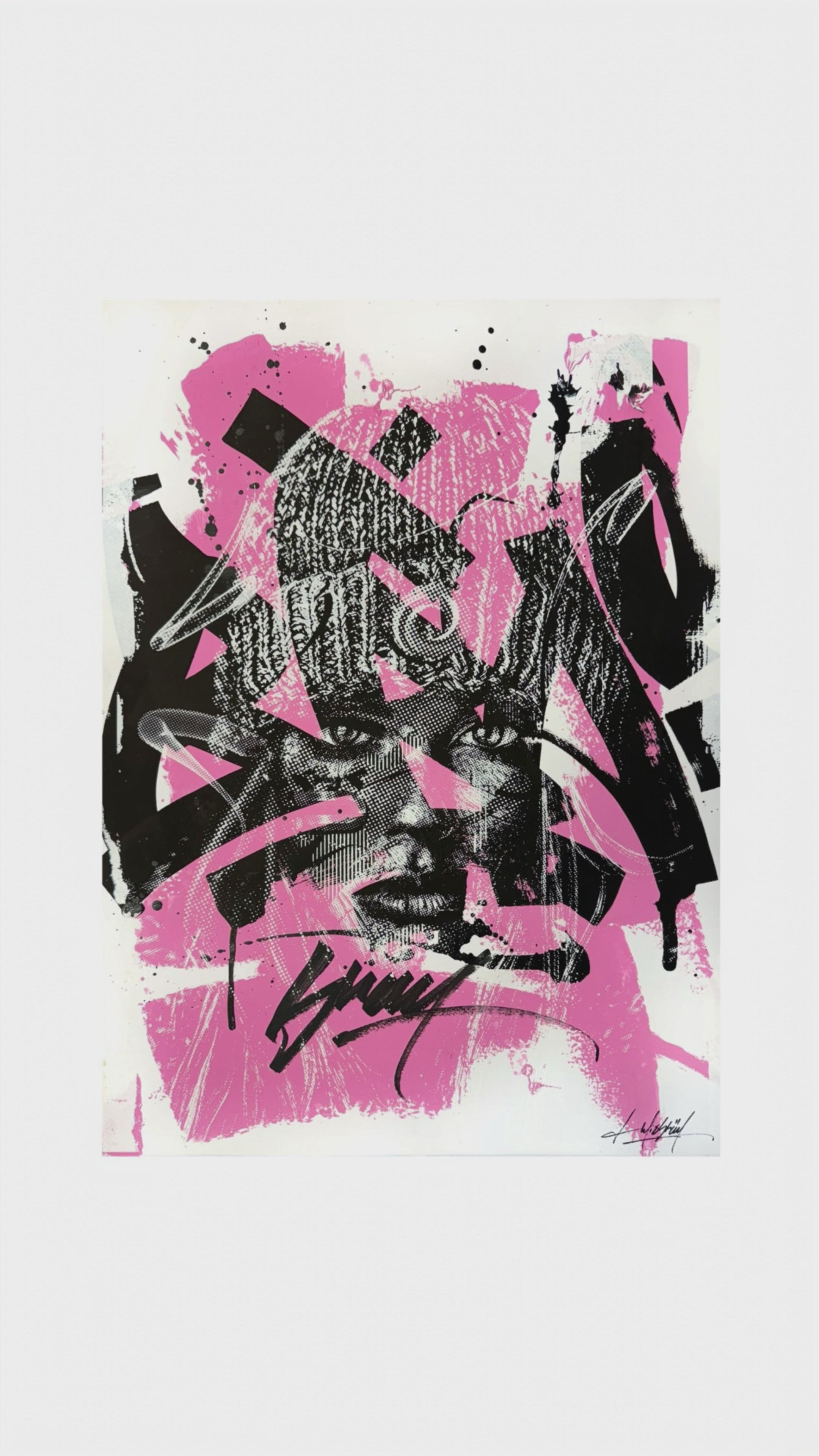 In this very special unit, all the process was made by stages. A full hand painted background, in paper, is carefully worked with spray and acrylics, and the screen print is done by hand, no press here, by the artist. Each one give us a final result unique and incredibly real. All the ink is visible in the several layers that are part of this composition.